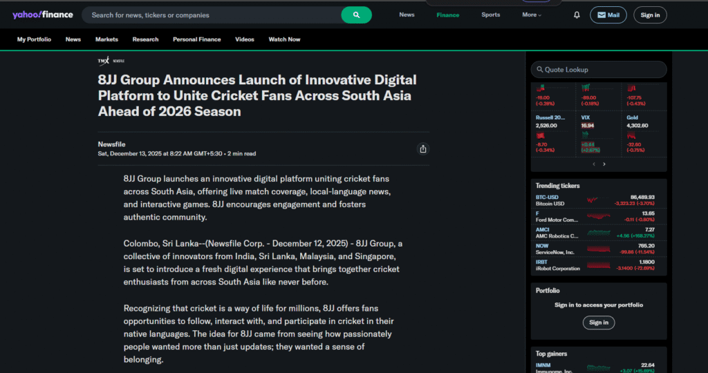 8JJ Group has been featured in Yahoo Finance, Business Insider, and Newsfile for its innovative sports platform that unites cricket fans across South Asia. The coverage highlights it’s focus on interactive features, live updates, and fan engagement within the cricket sports ecosystem.